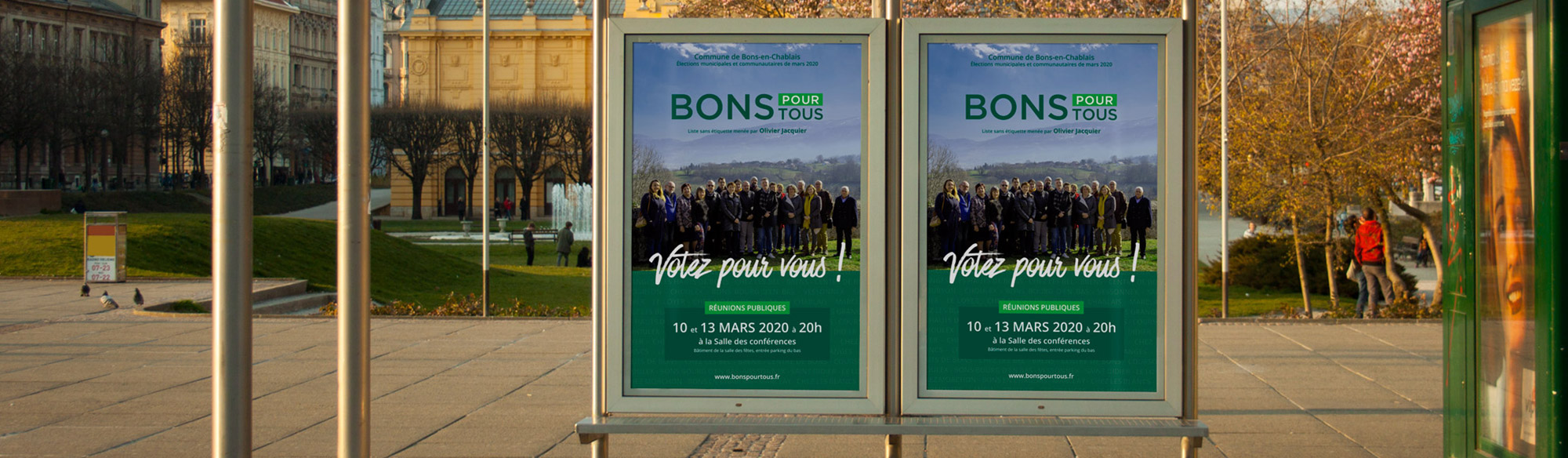 Conception du logo et d’éléments de communication pour la liste citoyenne d’opposition à Bons-en-Châblais, élue au premier tour lors de la campagne aux Municipales de 2020.
